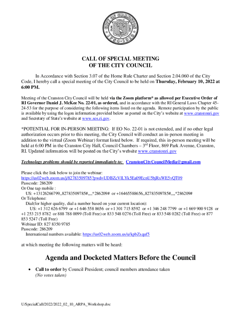 CALL OF SPECIAL MEETING OF THE CITY COUNCIL In Accordance with Section 3.07 of the Home Rule Charter and Section 2.04.060 of the City Code, I hereby call a special meeting of the City Council to be