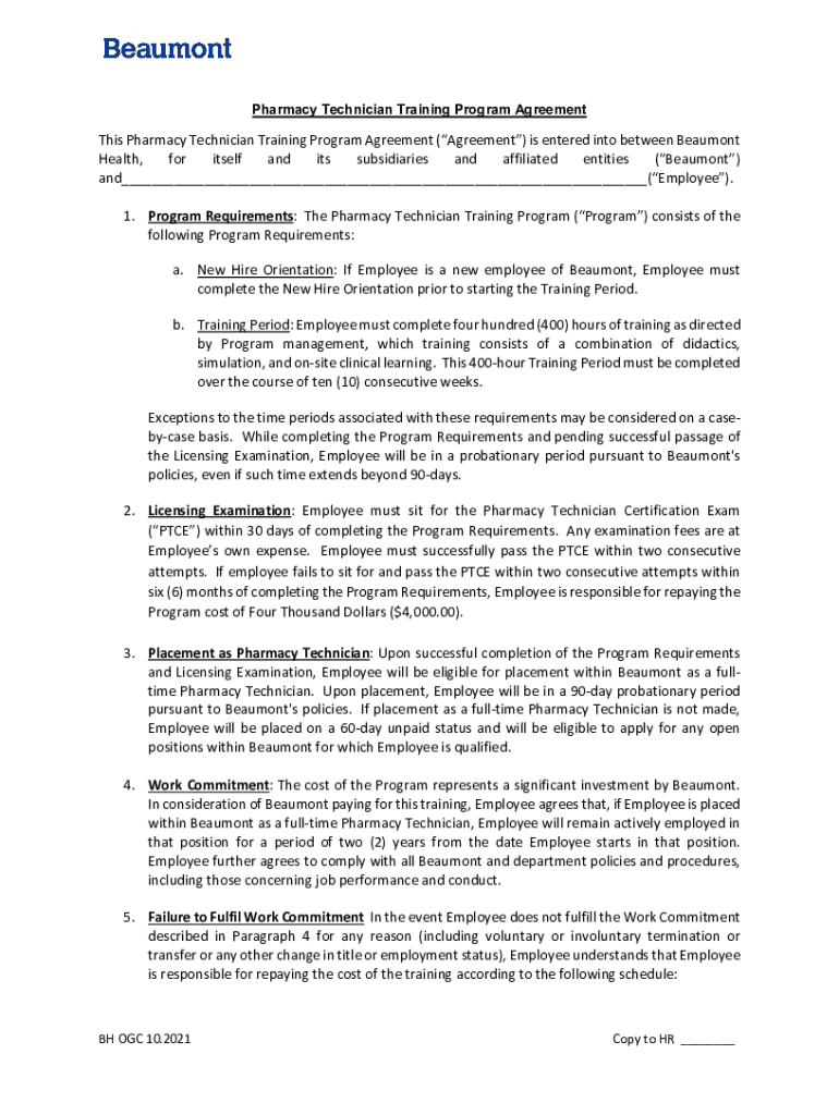Pharmacy Technician Training Program Agreements Pharmacy Technician Training Program Agreement (Agreement) is entered into between Beaumont Health, for itself and its subsidiaries and affiliated entities