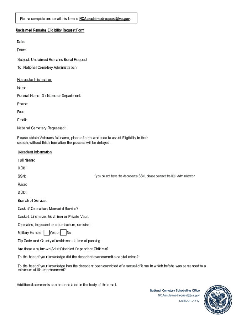 Please complete and email this form to NCAunclaimedrequest@va.gov. Unclaimed Remains Eligibility Request Form Date: From: Subject: Unclaimed Remains Burial Request To: National Cemetery Administration