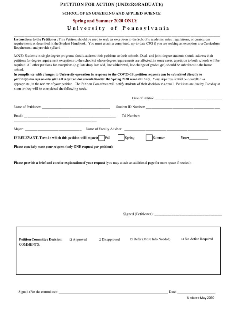 PETITION FOR ACTION (UNDERGRADUATE) SCHOOL OF ENGINEERING AND APPLIED SCIENCESpring and Summer 2020 ONLYUniversityofPennsylvania___ Instructions to the Petitioner: This Petition should be used to