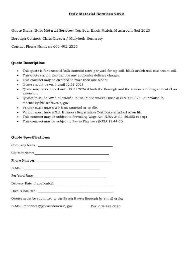 Bulk Material Services 2023Quote Name: Bulk Material Services: Top Soil, Black Mulch, Mushroom Soil 2023 Borough Contact: Chris Carson / Marybeth Hennessy Contact Phone Number: 6094922525Quote Description: