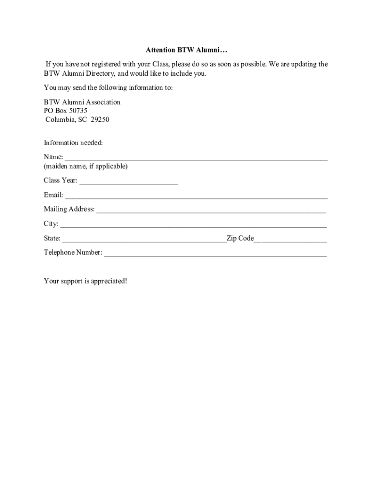 Fill out your btw alumni directory request online with pdfFiller!