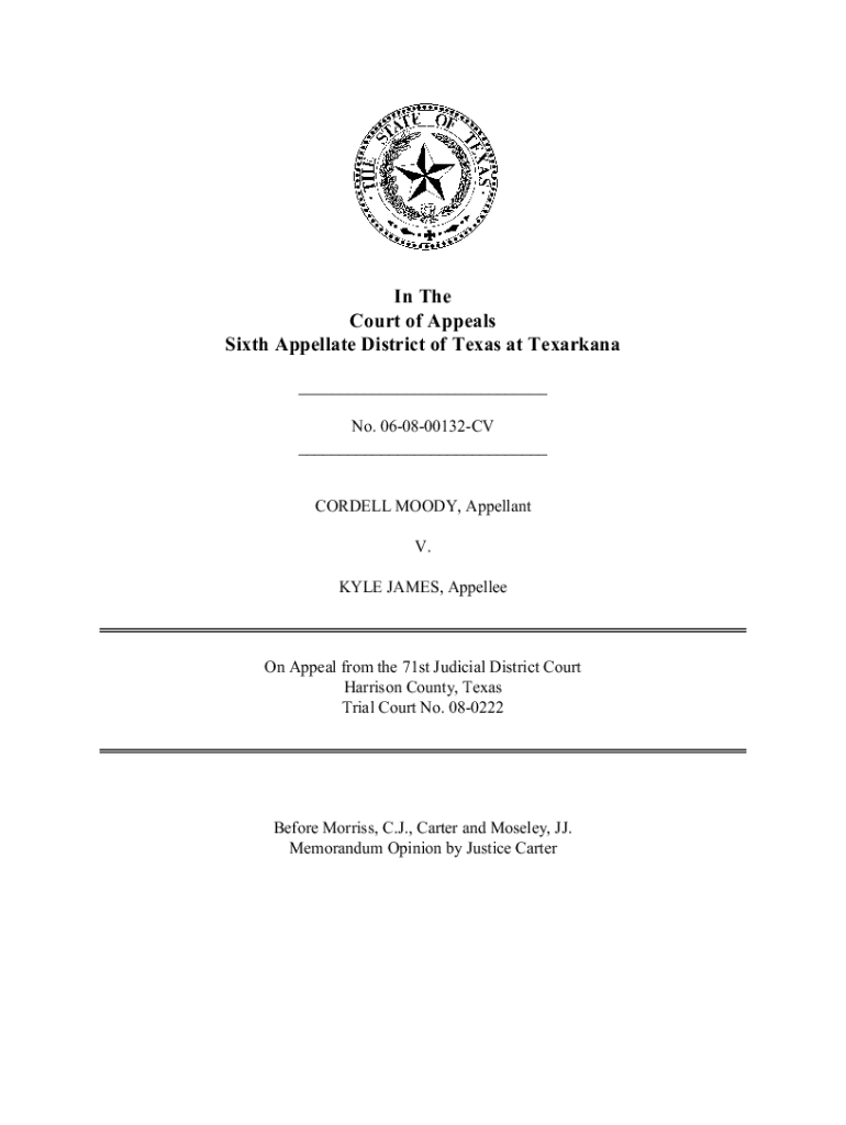 In The Court of Appeals Sixth Appellate District of Texas at Texarkana ___ No. 060800132CV ___CORDELL MOODY, Appellant V. KYLE JAMES, Appellation Appeal from the 71st Judicial District Court Harrison