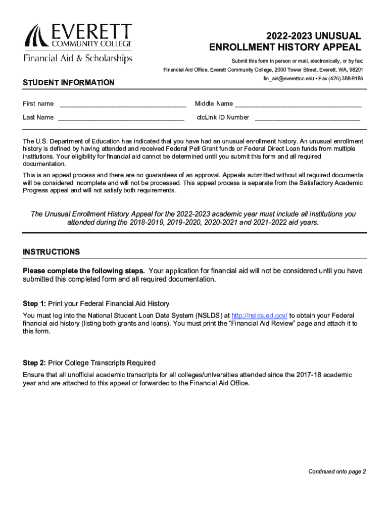 20222023 UNUSUAL ENROLLMENT HISTORY APPEAL Submit this form in person or mail, electronically, or by fax: Financial Aid Office, Everett Community College, 2000 Tower Street, Everett, WA, 98201STUDENT