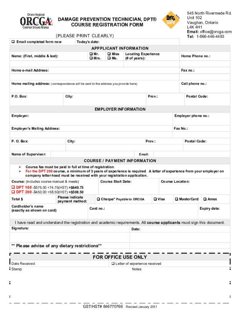 545 North Riverside Rd. Unit 102 Vaughan, Ontario L4K 4H1 Email: office@orcga.com Tel: 18664464493DAMAGE PREVENTION TECHNICIAN, DPT COURSE REGISTRATION FORM (PLEASE PRINT CLEARLY) Email completed