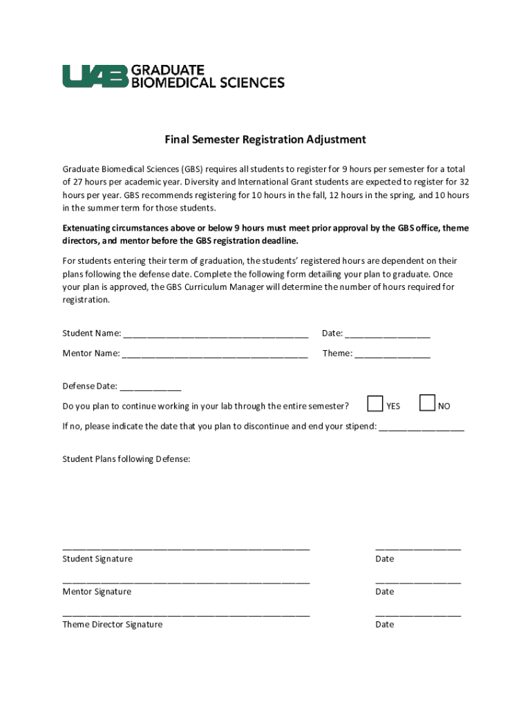 Final Semester Registration Adjustment Graduate Biomedical Sciences (GBS) requires all students to register for 9 hours per semester for a total of 27 hours per academic year. Diversity and International