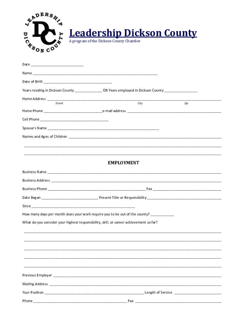 Leadership Dickson County program of the Dickson County Chamberlain ___ Name ___ Date of Birth ___ Years residing in Dickson County ___ OR Years employed in Dickson County ___ Home Address ___ StreetCityZipHome