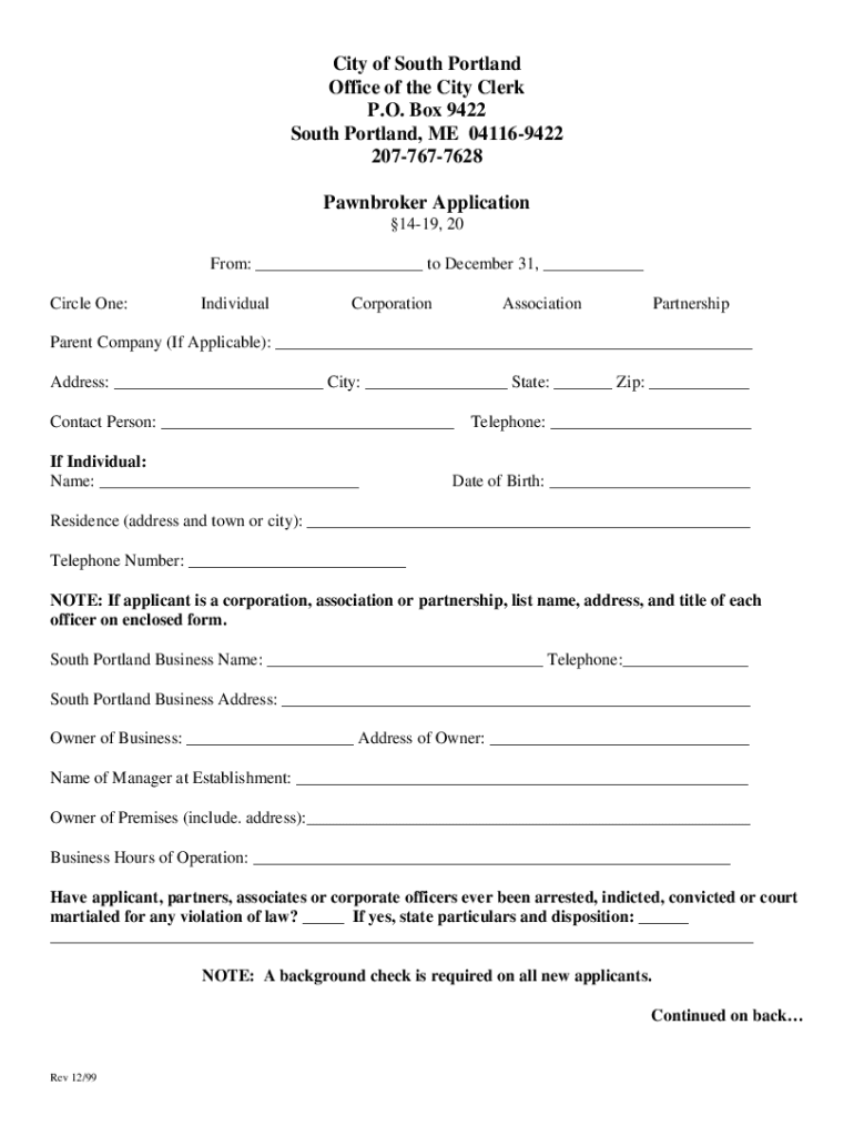 City of South Portland Office of the City Clerk P.O. Box 9422 South Portland, ME 041169422 2077677628 Pawnbroker Application 1419, 20 From: ___ to December 31, ___ Circle One:IndividualCorporationAssociationPartnershipParent