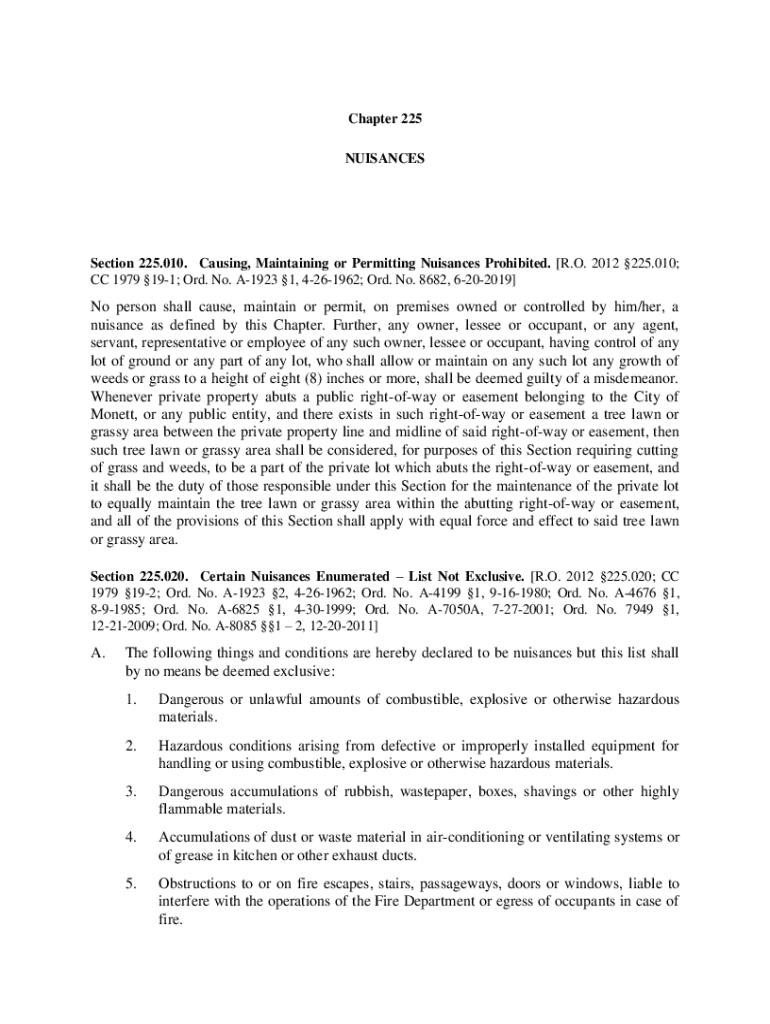 Chapter 225 NUISANCESSection 225.010. Causing, Maintaining or Permitting Nuisances Prohibited. [R.O. 2012 225.010; CC 1979 191; ORD. No. A1923 1, 4261962; ORD. No. 8682, 6202019]No person shall cause,