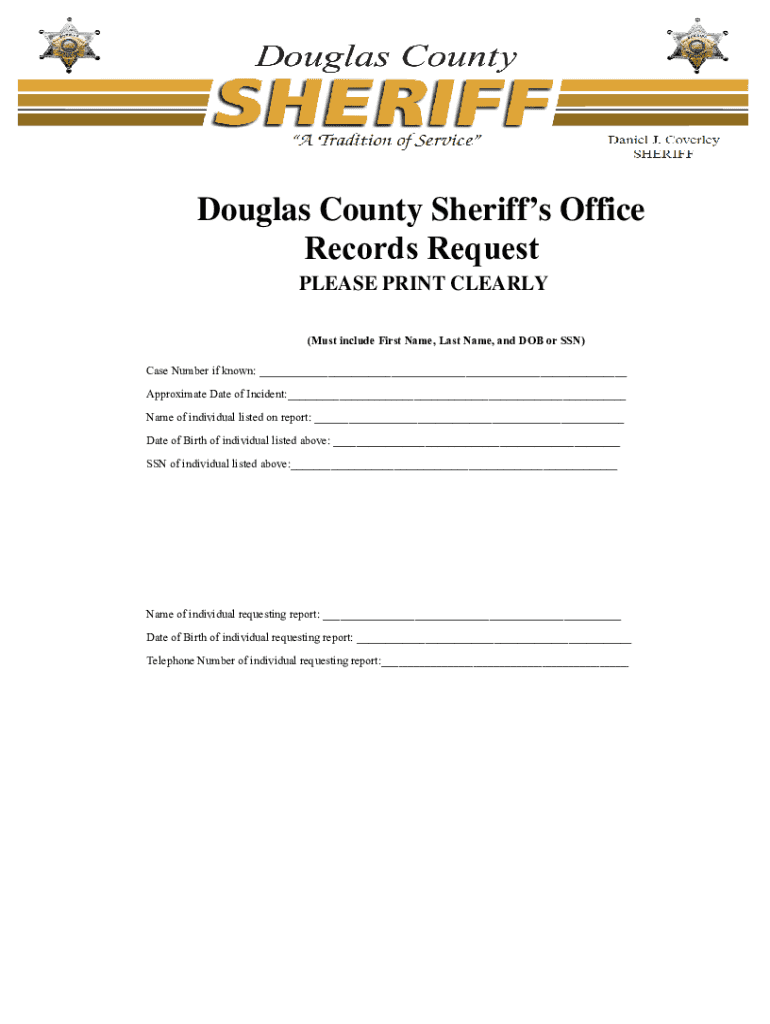 Douglas County Sheriffs Office Records Request PLEASE PRINT CLEARLY (Must include First Name, Last Name, and DOB or SSN) Case Number if known: ___ Approximate Date of Incident:___ Name of individual
