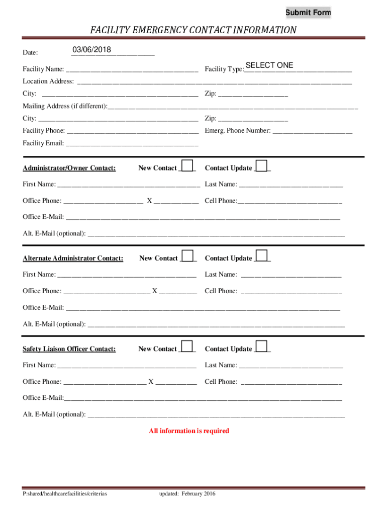 Submit Formability EMERGENCY CONTACT INFORMATION Date:03/06/2018 ___SELECT ONE Facility Name: ___ Facility Type:___ Location Address: ___ City: ___ Zip: ___ Mailing Address (if different):___ City: