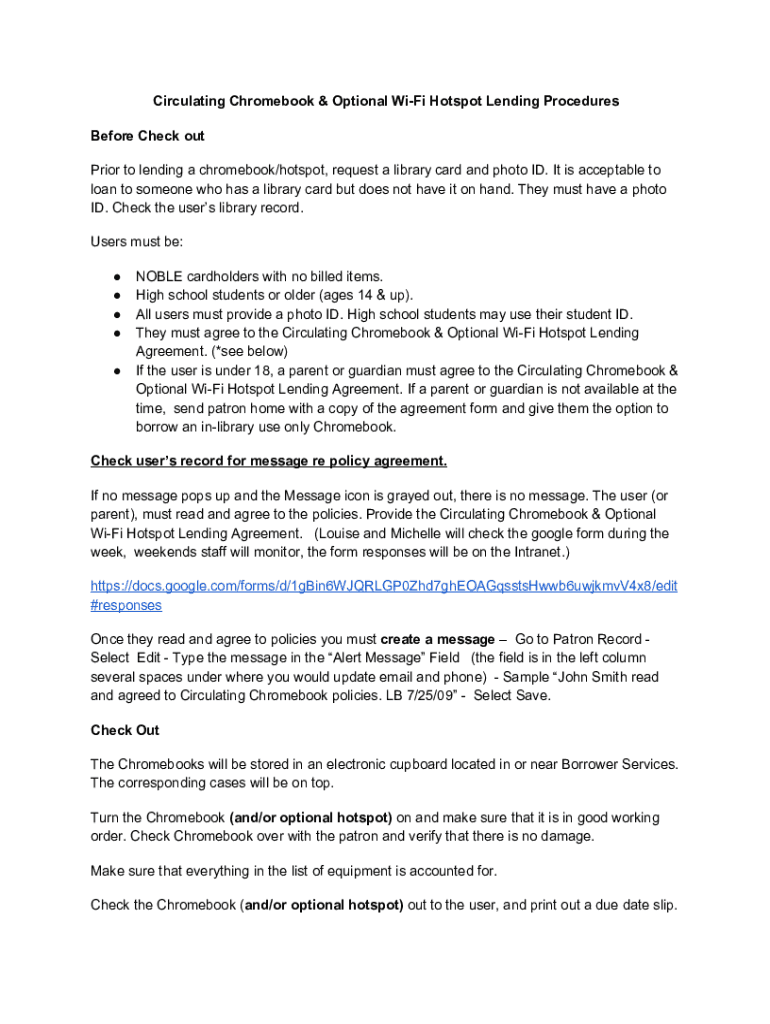 Circulating Chromebook & Optional Wi-Fi Hotspot Lending Procedures Before Check out Prior to lending a Chromebook/hotspot, request a library card and photo ID. It is acceptable to loan to someone