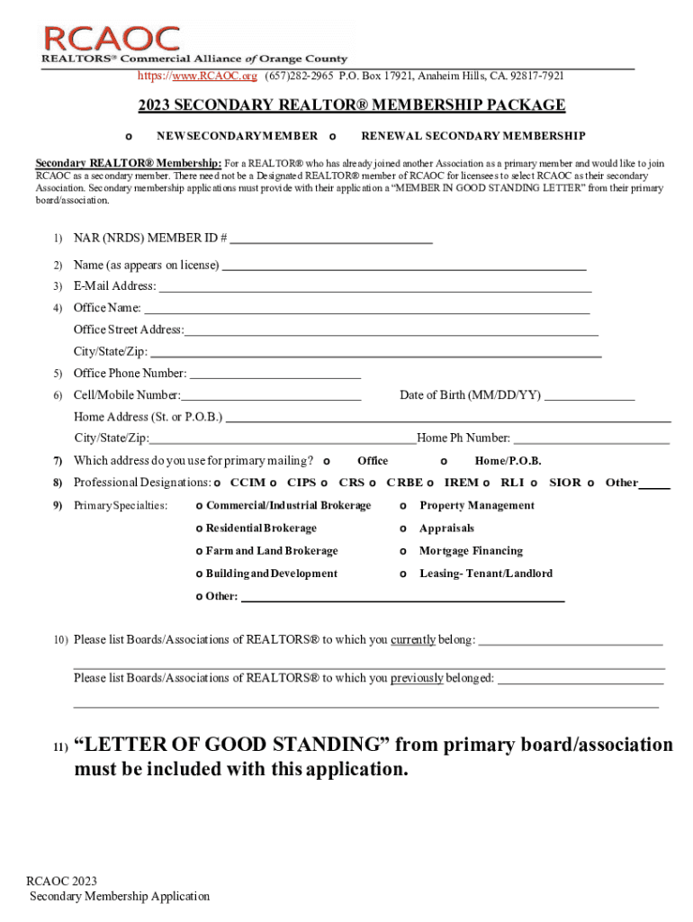 HTTPS://www.RCAOC.org (657)2822965 P.O. Box 17921, Anaheim Hills, CA. 9281779212023 SECONDARY REALTOR MEMBERSHIP PACKAGE