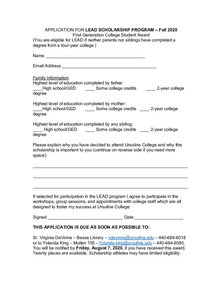 APPLICATION FOR LEAD SCHOLARSHIP PROGRAM Fall 2020 First Generation College Student Award (You are eligible for LEAD if neither parents nor siblings have completed a degree from a Fourier college.)