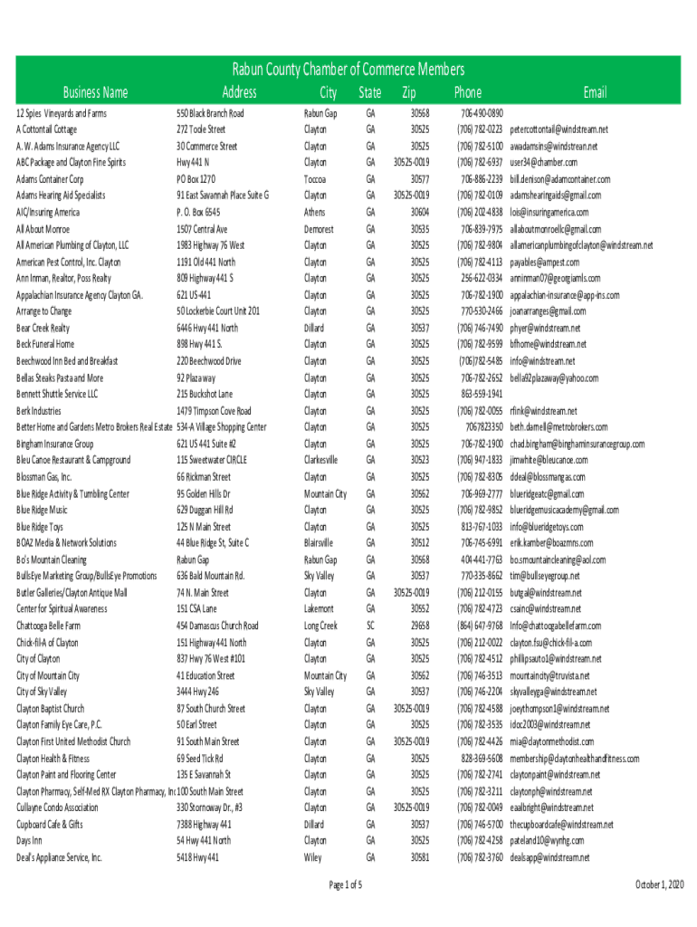 Rabin County Chamber of Commerce Members Business NameAddress12 Spies Vineyards and Farms 550 Black Branch Road A Cottontail Cottage 272 Toole Street A. W. Adams Insurance Agency LLC 30 Commerce Street