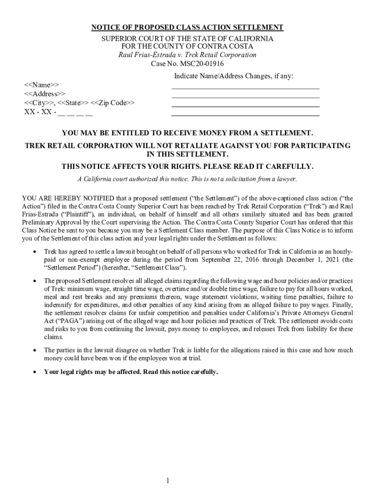 NOTICE OF PROPOSED CLASS ACTION SETTLEMENT SUPERIOR COURT OF THE STATE OF CALIFORNIA FOR THE COUNTY OF CONTRA COSTA Raul FriasEstrada v. Trek Retail Corporation Case No. MSC2001916 Indicate Name/Address