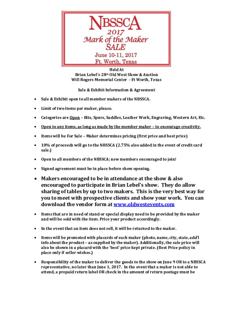 Held At Brian Levels 28th Old West Show & Auction Will Rogers Memorial Center Ft Worth, Texas Sale & Exhibit Information & Agreement Sale & Exhibit open to all member makers of the NBS SCA. Limit