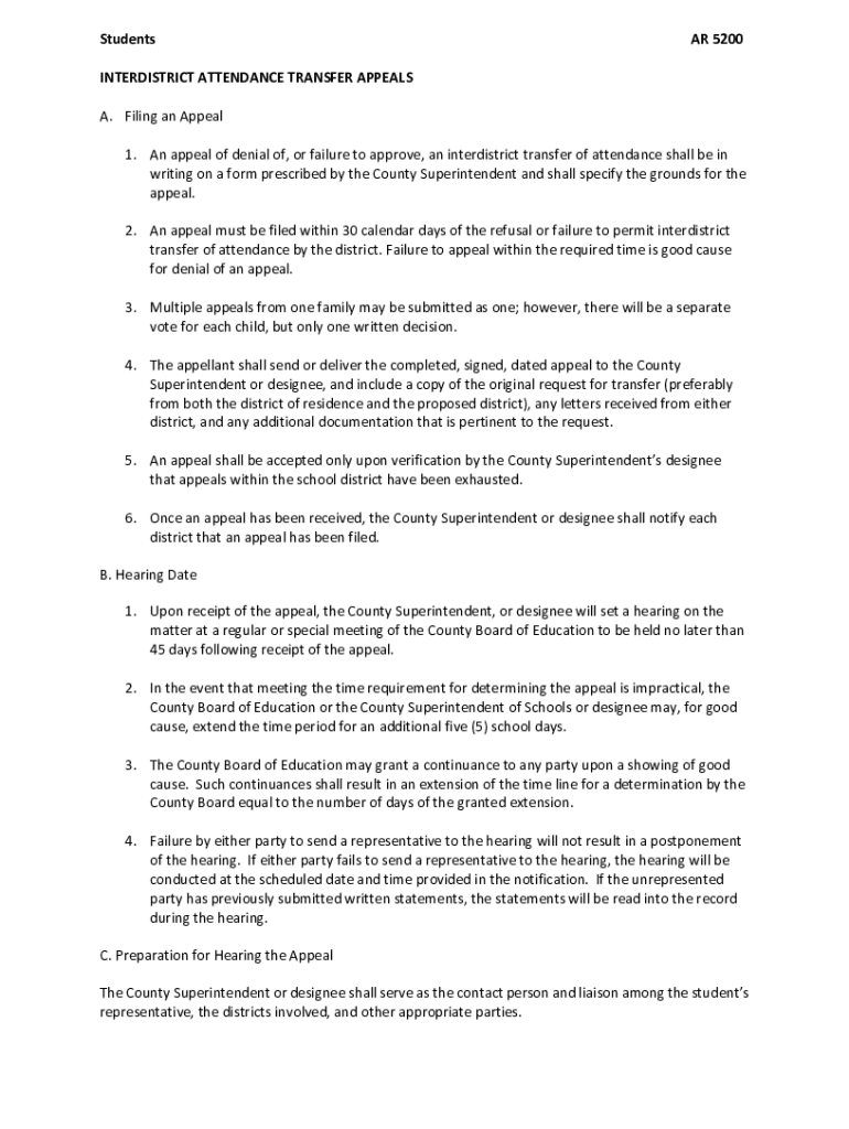 Students AR 5200INTERDISTRICT ATTENDANCE TRANSFER APPEALS A. Filing an Appeal 1. An appeal of denial of, or failure to approve, an interdistrict transfer of attendance shall be in writing on a form