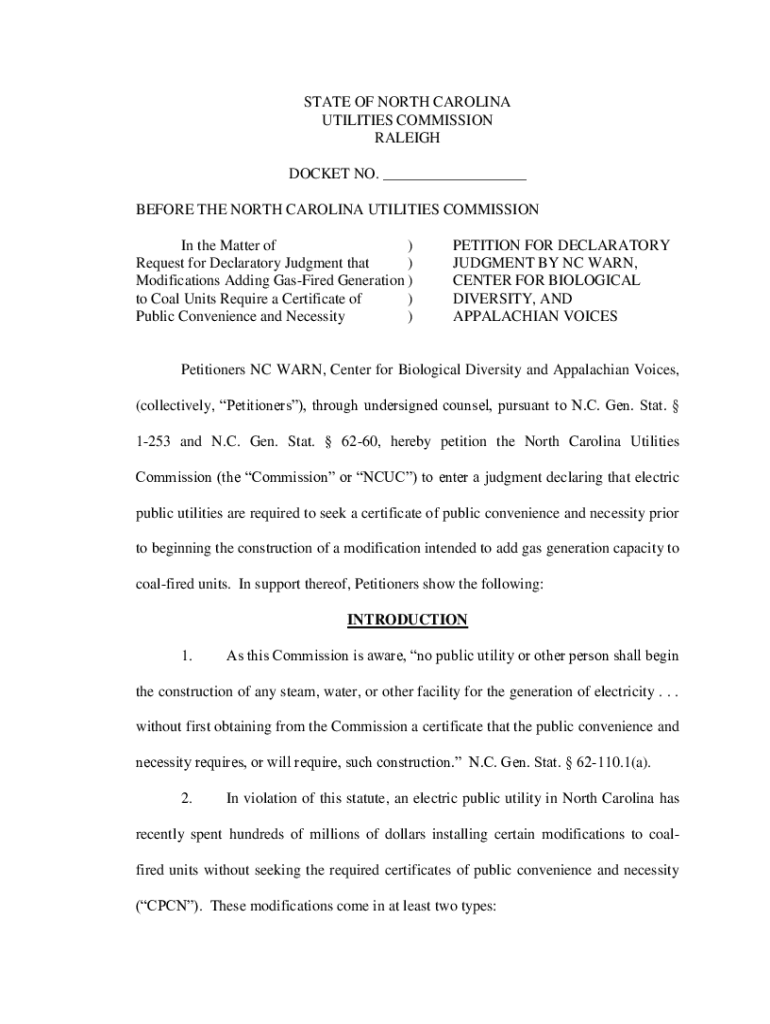 STATE OF NORTH CAROLINA UTILITIES COMMISSION RALEIGH DOCKET NO. ___ BEFORE THE NORTH CAROLINA UTILITIES COMMISSION In the Matter of) Request for Declaratory Judgment that) Modifications Adding Aspired