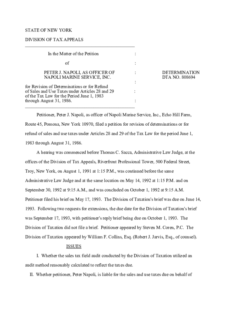 STATE OF NEW YORK DIVISION OF TAX APPEALS ___ In the Matter of the Petition of PETER J. NAOMI, AS OFFICER OF NAOMI MARINE SERVICE, INC.: : :: for Revision of Determinations or for Refund of Sales