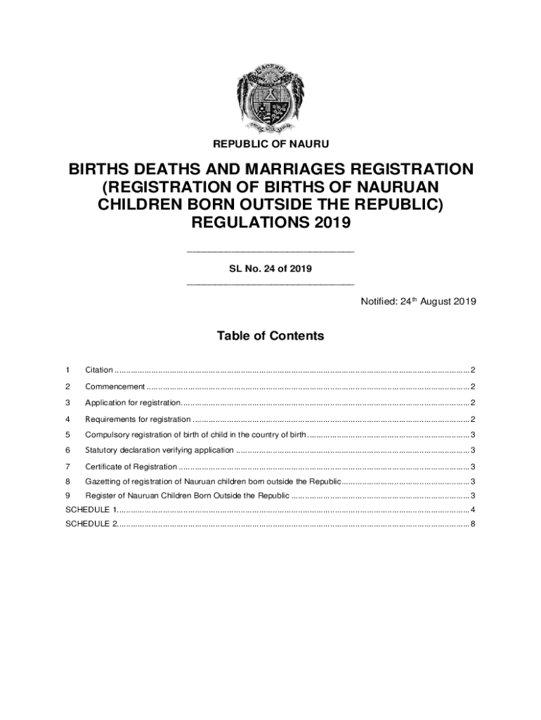 REPUBLIC OF NAURUBIRTHS DEATHS AND MARRIAGES REGISTRATION (REGISTRATION OF BIRTHS OF NAURU CHILDREN BORN OUTSIDE THE REPUBLIC) REGULATIONS 2019 ___ SL No. 24 of 2019 ___ Notified: 24th August 2019Table