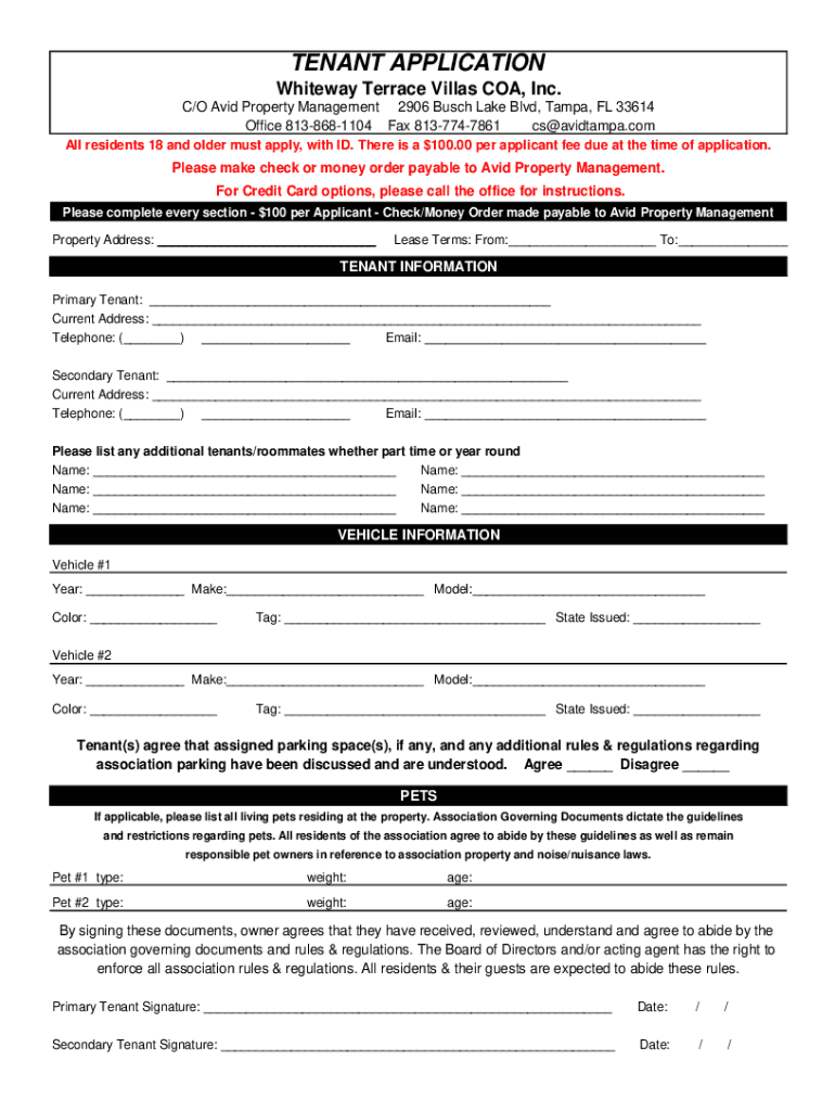 TENANT APPLICATION White way Terrace Villas COA, Inc. C/O Avid Property Management 2906 Busch Lake Blvd, Tampa, FL 33614 Office 8138681104 Fax 8137747861 cs@avidtampa.com All residents 18 and older
