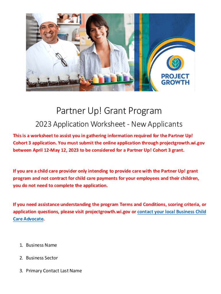 Partner Up! Grant Program 2023 Application Worksheet New Applicants This is a worksheet to assist you in gathering information required for the Partner Up! Cohort 3 application. You must submit the