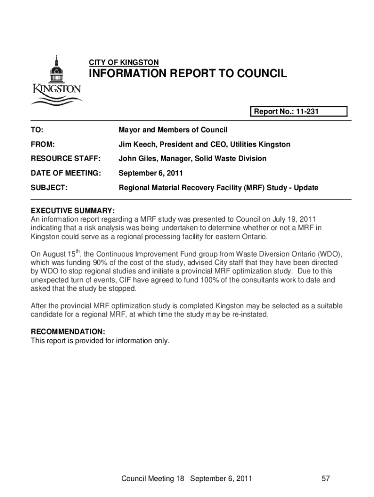 TO:Mayor and Members of Councilor:Jim Beech, President and CEO, Utilities KingstonRESOURCE STAFF:John Giles, Manager, Solid Waste Divisional