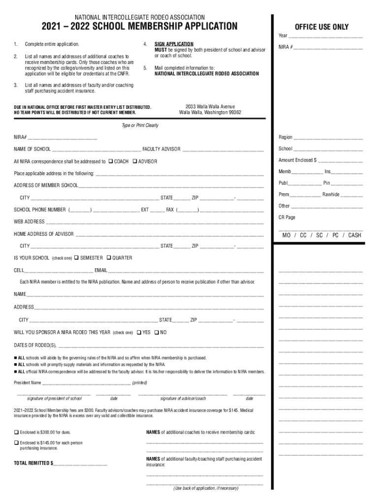 National intercollegiate rodeo association2021 2022 School membership application office use only Year___1. Complete entire application. 2. List all names and addresses of additional coaches to receive