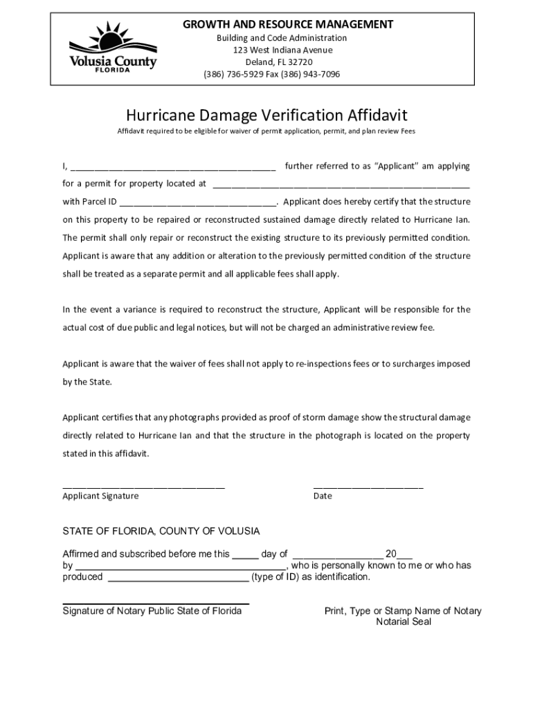 GROWTH AND RESOURCE MANAGEMENT Building and Code Administration 123 West Indiana Avenue Demand, FL 32720 (386) 7365929 Fax (386) 9437096Hurricane Damage Verification AffidavitAffidavit required to