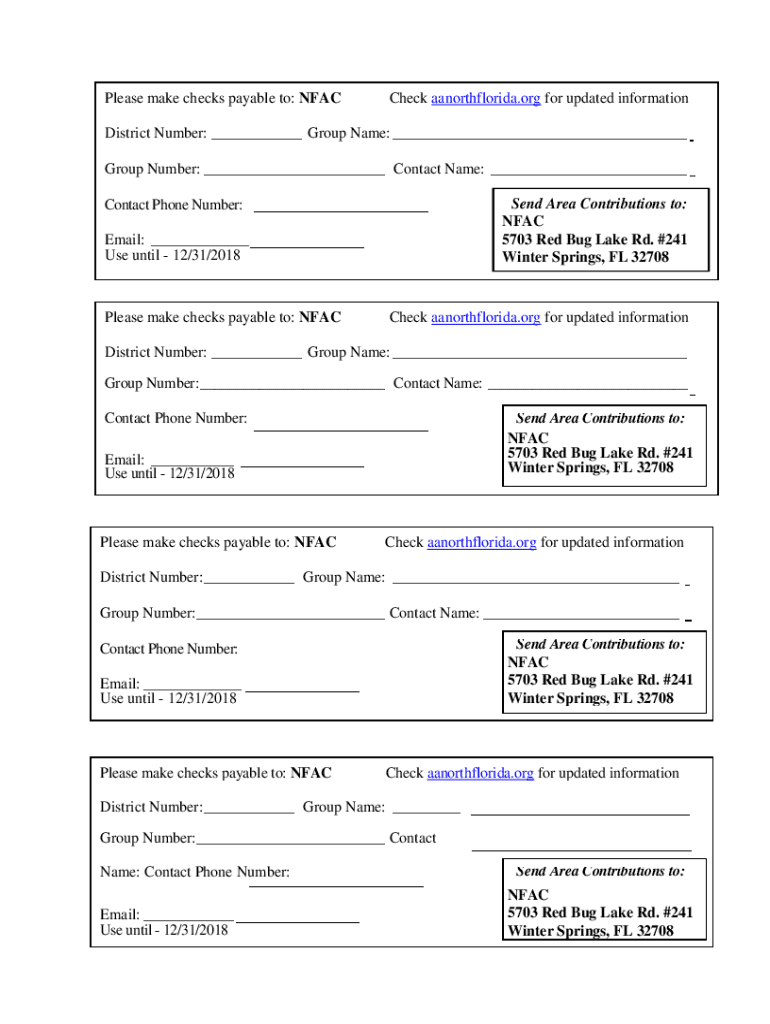 Please make checks payable to: Paycheck aanorthflorida.org for updated informationDistrict Number: ___ Group Name: ___ Group Number: ___ Contact Name: ___ Send Area Contributions to: NFC 5703 Red