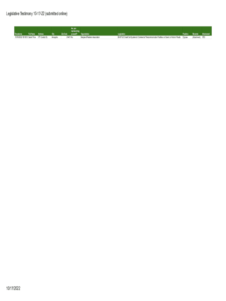 Legislative Testimony 101722 (submitted online)Timestamp Full Name 10/16/2022 18:16:03 Sarah Price10/17/2022Address 171 Conduit St. City Annapolis you're representing Zip Code yourself? 21401 Organization