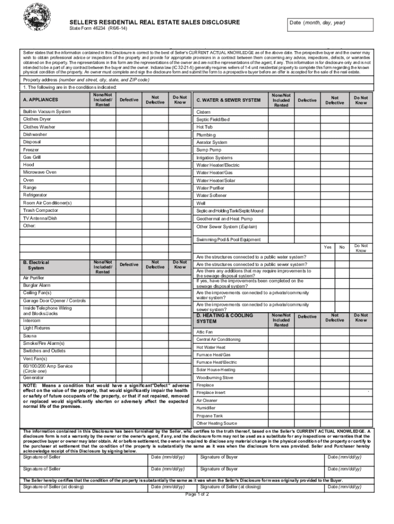 SELLER\'S RESIDENTIAL REAL ESTATE SALES DISCLOSUREDate (month, day, year)State Form 46234 (R6/614) Note: This form has been modified from the version currently found at 876 IAC 912 to include questions