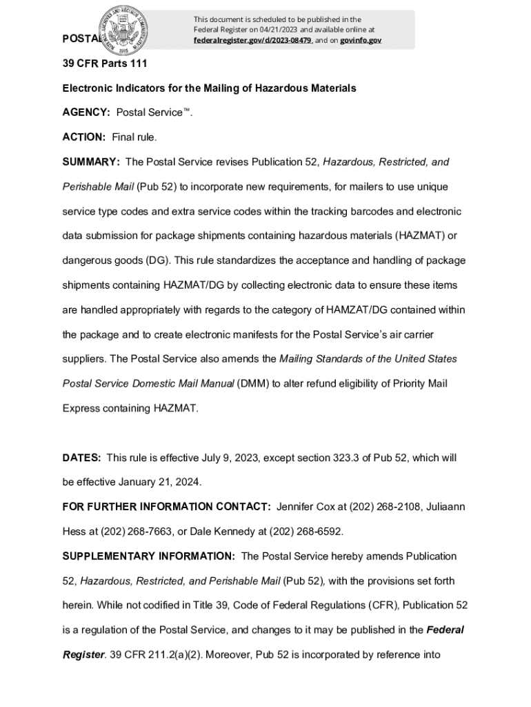 POSTAL Services document is scheduled to be published in the Federal Register on 04/21/2023 and available online at federalregister.gov/d/202308479, and on gov info.gov39 CFR Parts 111 Electronic