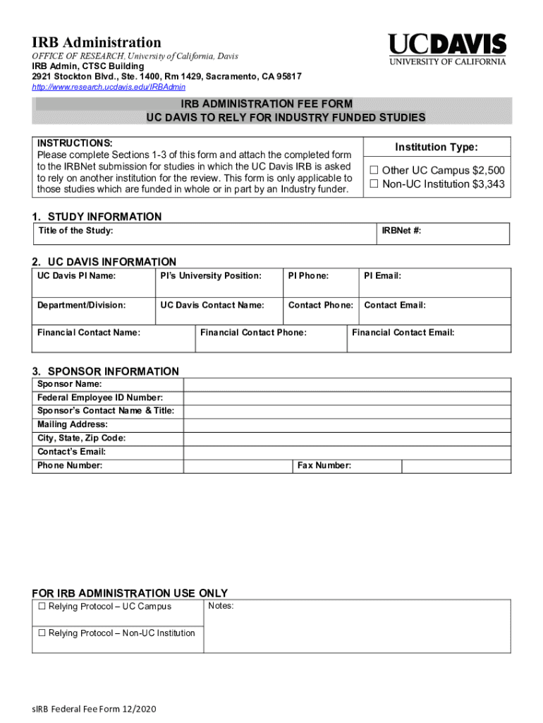 Get the free Reliance Fee Form - IRB Administration - research ucdavis