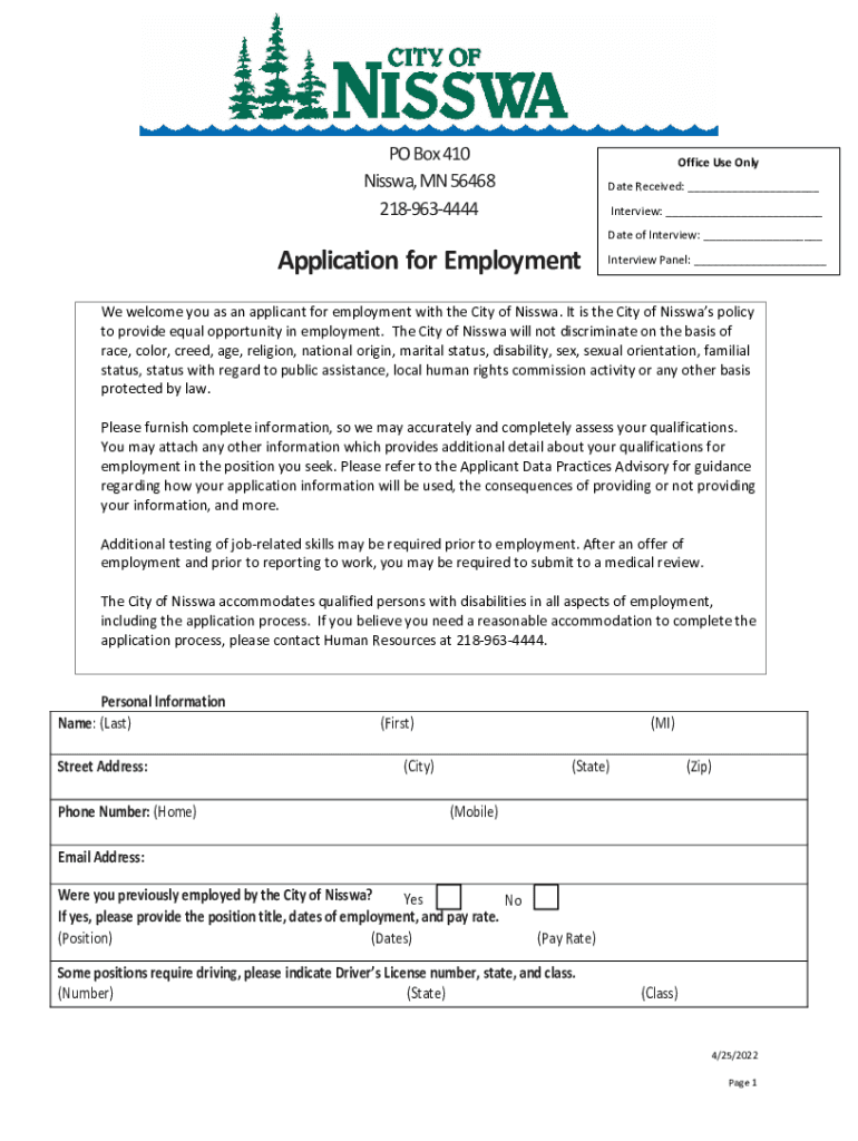 PO Box 410 Nissan, MN 56468 2189634444Office Use Only Date Received: ___ Interview: ___Application for EmploymentDate of Interview: ___ Interview Panel: ___We welcome you as an applicant for employment