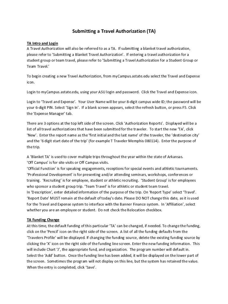 Submitting a Travel Authorization (TA) TA Intro and Login A Travel Authorization will also be referred to as a TA. If submitting a blanket travel authorization, please refer to Submitting a Blanket
