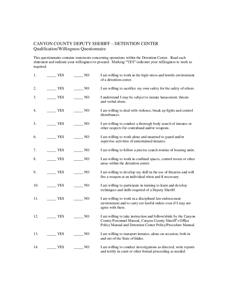 CANYON COUNTY DEPUTY SHERIFF DETENTION CENTER Qualification/Willingness Questionnaire This questionnaire contains statements concerning operations within the Detention Center. Read each statement