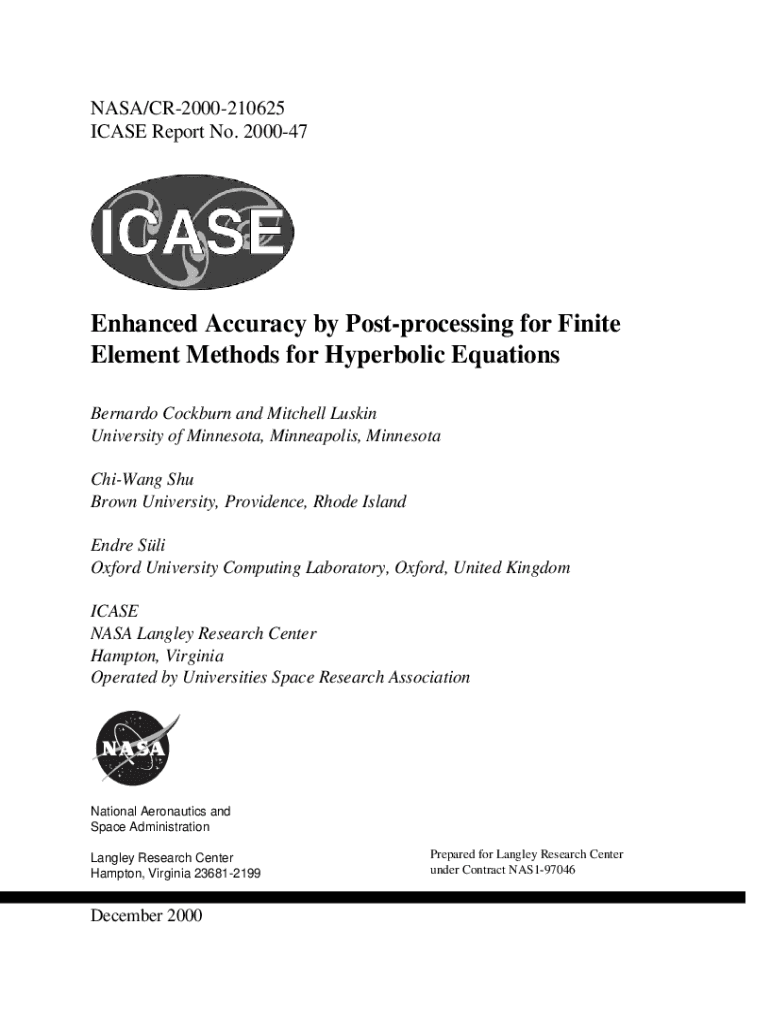 NASA/CR2000210625 CASE Report No. 200047Enhanced Accuracy by Post-processing for Finite Element Methods for Hyperbolic Equations Bernardo Cockburn and Mitchell Ruskin University of Minnesota, Minneapolis,