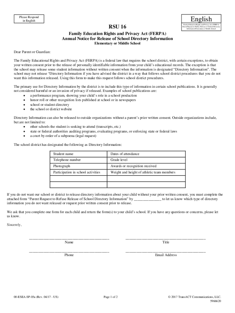 Please Respond in English Family Education Rights and Privacy Act (FER PA) Parent Request to Refuse Release of School Directory Information Elementary or Middle Schools 16 Family Education Rights
