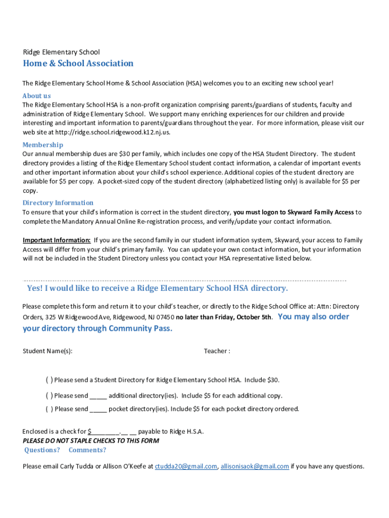 Ridge Elementary Schoolhouse & School Association The Ridge Elementary School Home & School Association (HSA) welcomes you to an exciting new school year! About us The Ridge Elementary School HSA