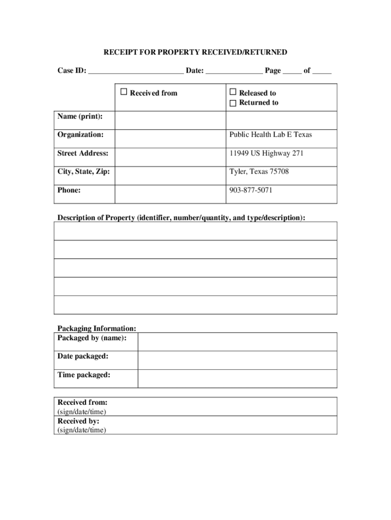 RECEIPT FOR PROPERTY RECEIVED/RETURNED Case ID: ___ Date: ___ Page ___ of ___ Received fromReleased to Returned name (print): Organization:Public Health Lab E TexasStreet Address:11949 US Highway