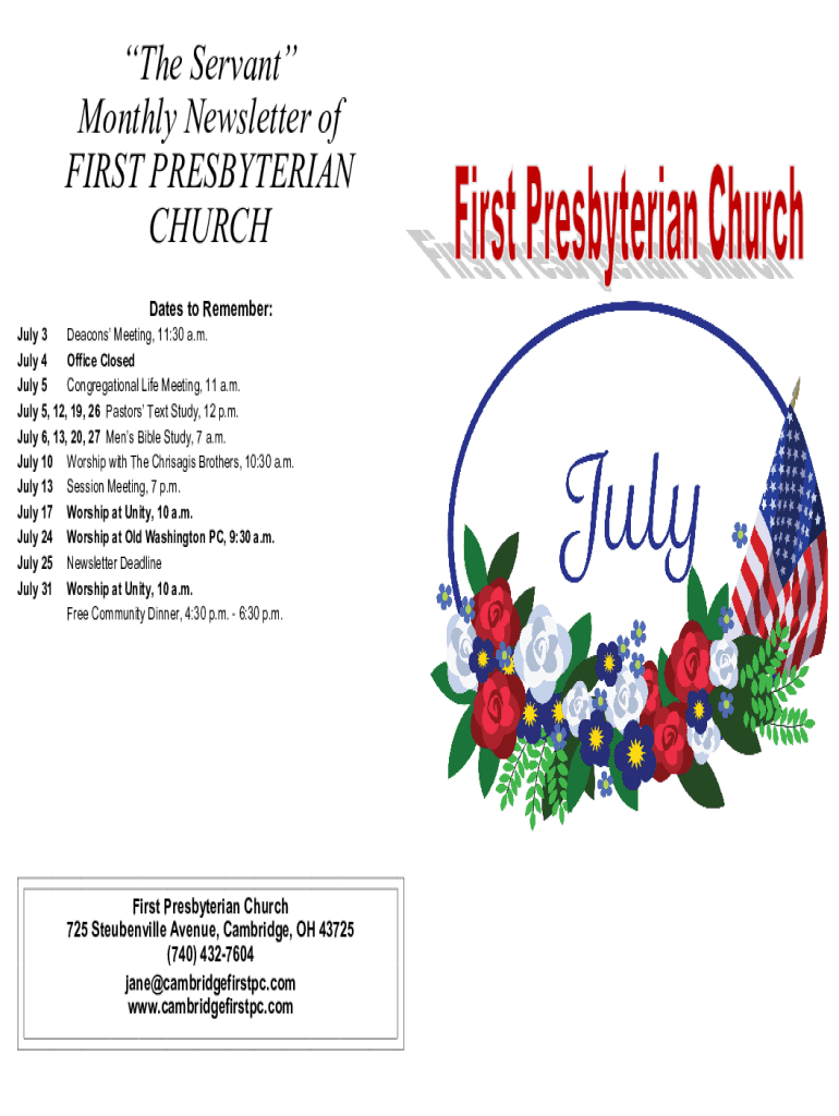 The Servant Monthly Newsletter of FIRST PRESBYTERIAN CHURCH Dates to Remember: July 3 Deacons Meeting, 11:30 a.m. July 4 Office Closed July 5 Congregational Life Meeting, 11 a.m. July 5, 12, 19, 26