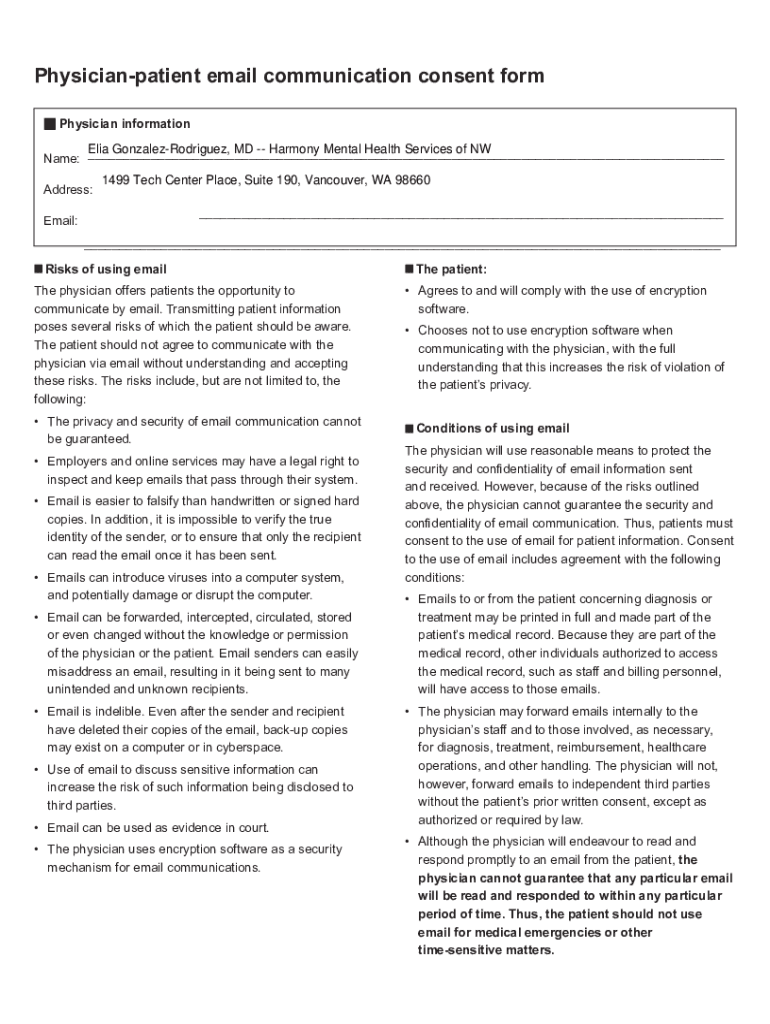 Physician patient email communication consent form n Physician information Name: ___ Address: ___Email:___ n Risks of using email physician offers patients the opportunity to communicate by email.