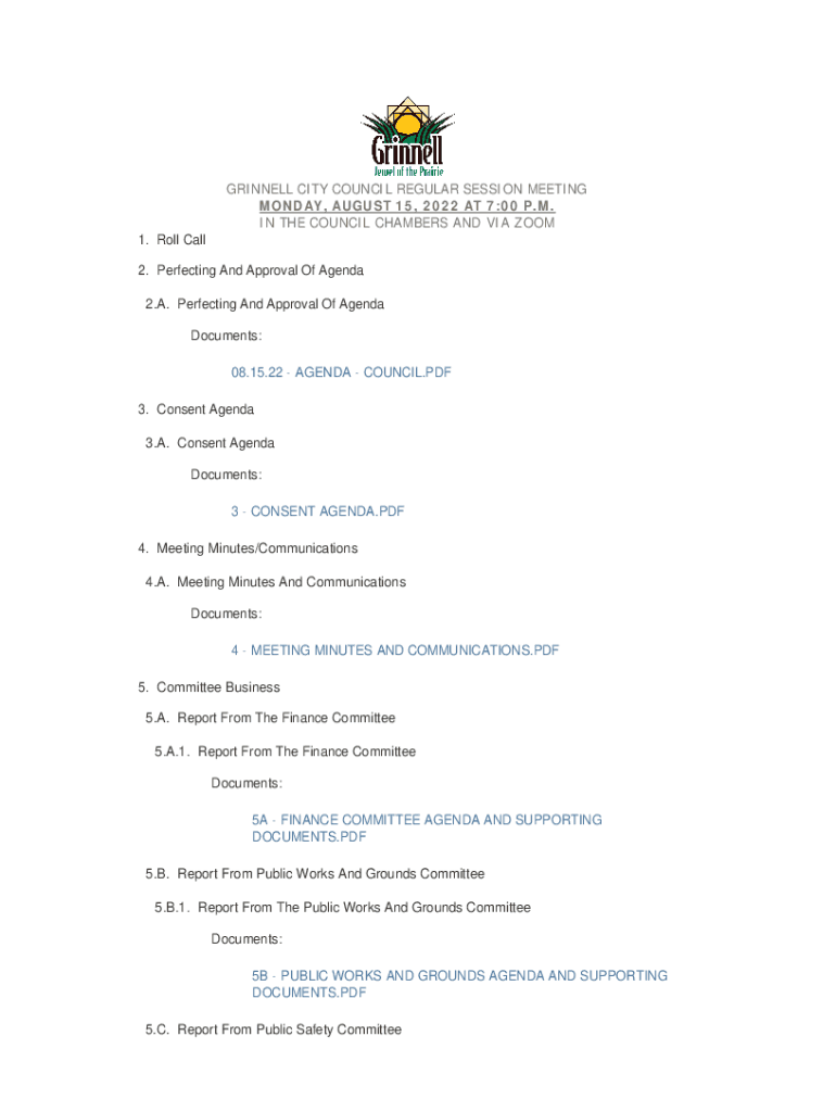 GRINNED CITY COUNCIL REGULAR SESSION MEETING MONDAY, AUGUST 15, 2022, AT 7:00 P.M. IN THE COUNCIL CHAMBERS AND VIA ZOOM 1. Roll Call 2. Perfecting And Approval Of Agenda 2. A. Perfecting And Approval