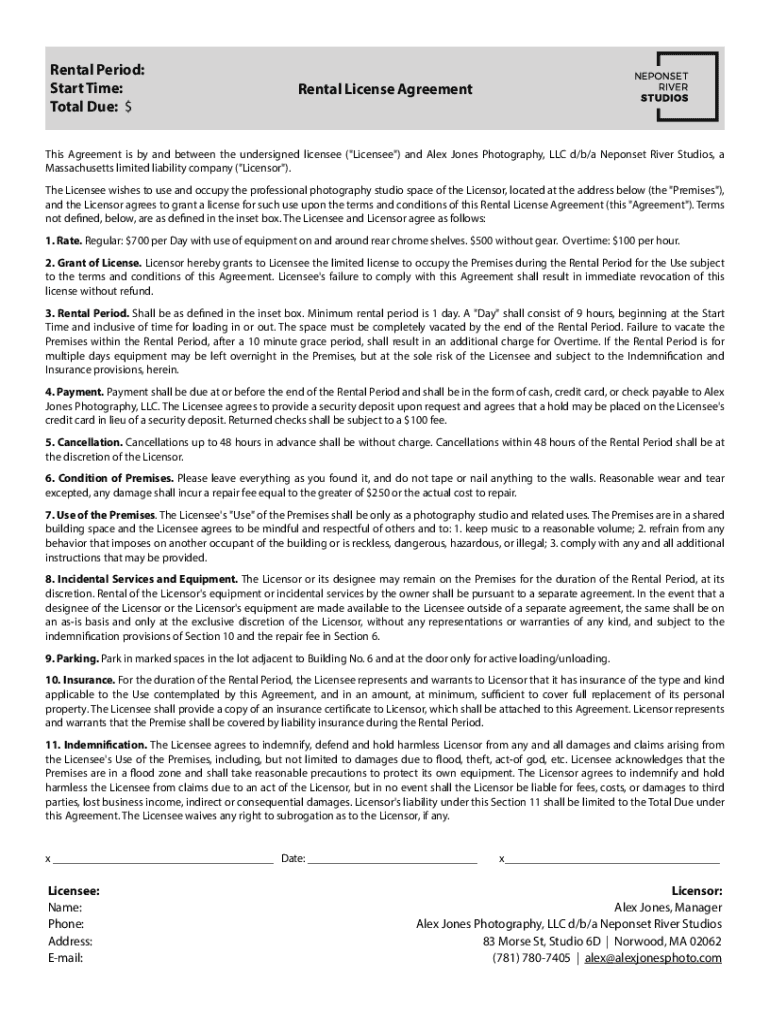Rental Period: Start Time: Total Due: rental License Agreements Agreement is by and between the undersigned licensee (\” Licensee\”) and Alex Jones Photography, LLC d/b/a Response River Studios,