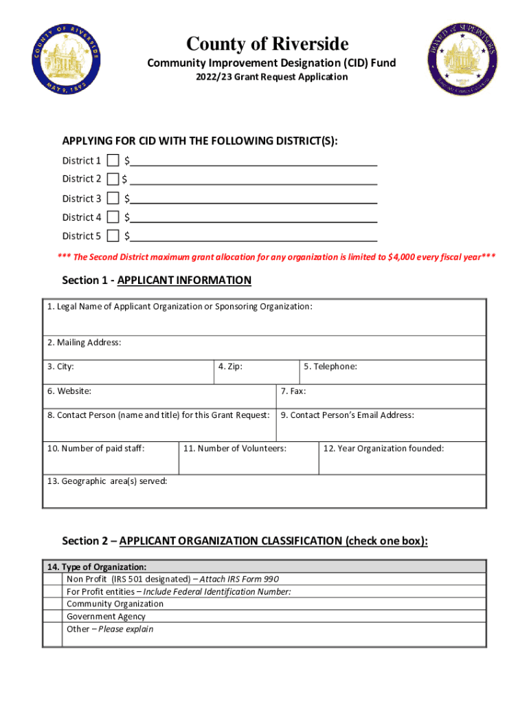 County of RiversideCommunity Improvement Designation (CID) Fund 2022/23 Grant Request ApplicationAPPLYING FOR CID WITH THE FOLLOWING DISTRICT(S): District $1District $2District $3District $4District