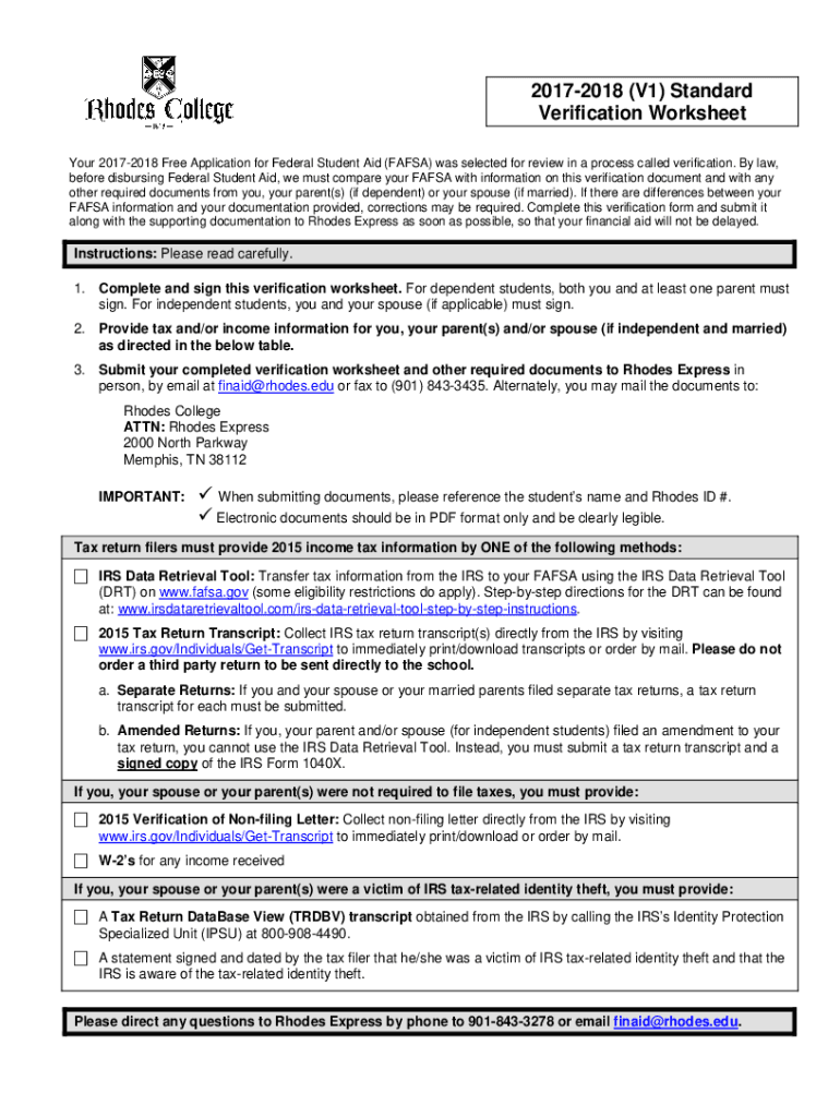 20172018 (V1) Standard Verification Worksheet Your 20172018 Free Application for Federal Student Aid (FAFSA) was selected for review in a process called verification. By law, before disbursing Federal