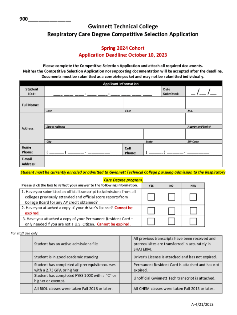 Respiratory Care Degree Application Instructions Spring 2024 Cohort Program Application Deadline: October 10, 2023, Step 1:Complete the attached Respiratory Care Degree application form. Read the