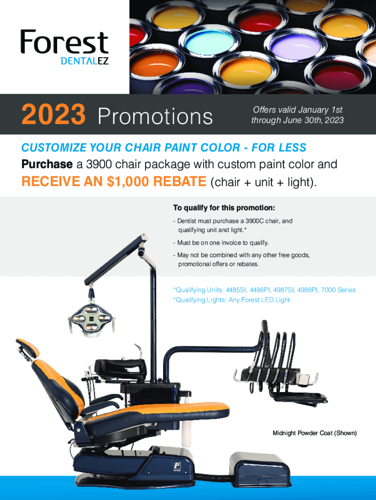 2023PromotionsOffers valid January 1st through June 30th, 2023CUSTOMIZE YOUR CHAIR PAINT COLOR FOR LESS Purchase a 3900 chair package with custom paint color undeceive AN $1,000 REBATE (chair + unit
